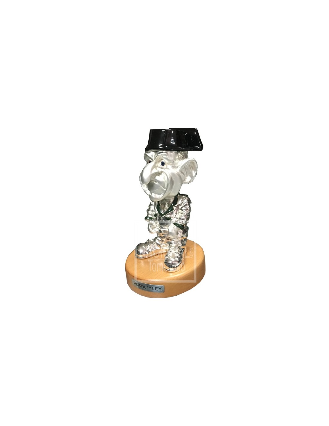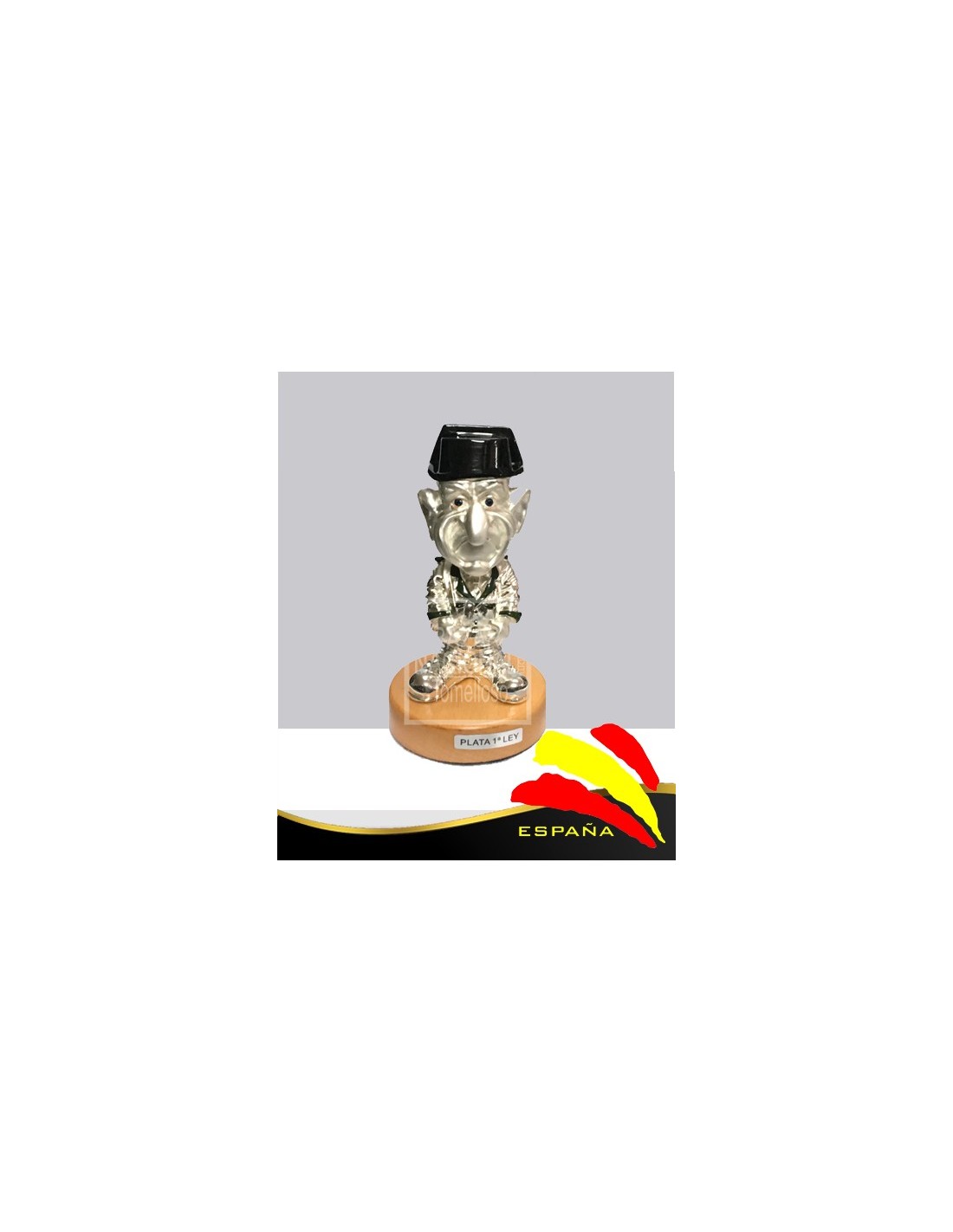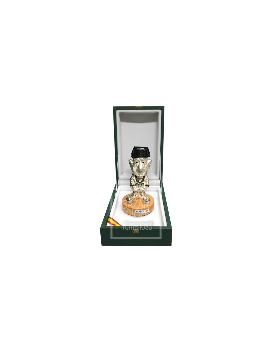 Escultura de la caricatura de un Guardia Civil, medida 10 x 5 cm. material de resina con baño de plata de ley, detalles de color esmaltado. Se presenta en estuche con el interior de raso y estampación en oro y cierre dorado en el exterior.