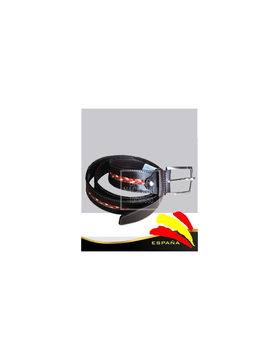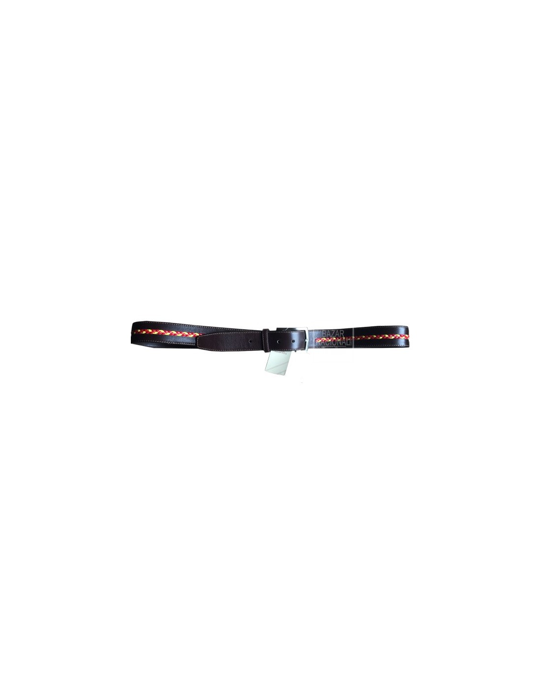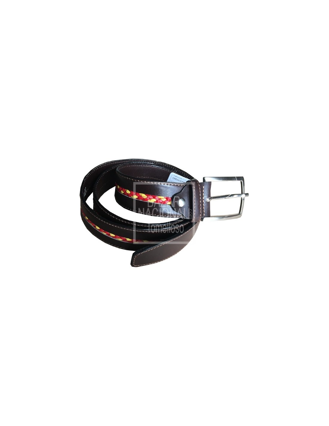 Cinturón de piel en color marrón con trenzado en el centro de los colores de la Bandera de España. Medida 127 cm. Se presenta en caja de cartón para regalo.
