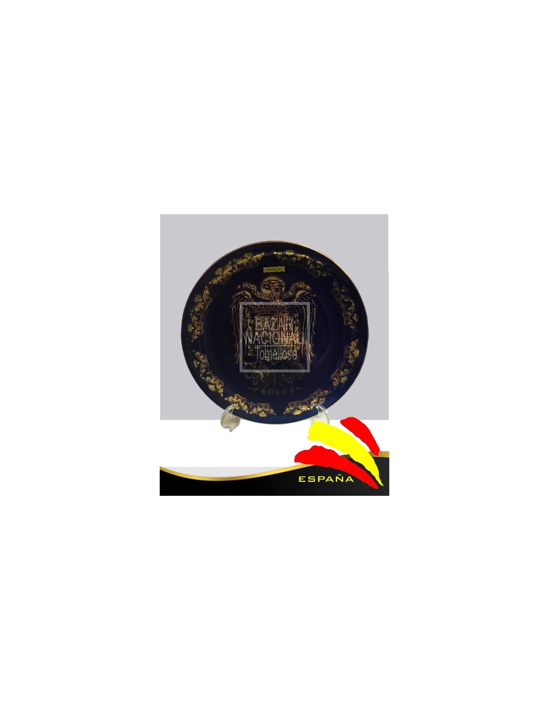 Plato decorativo con el emblema del Águila de San Juan impreso en oro de ley sobre azul cobalto. Se entrega con pié para sobremesa.