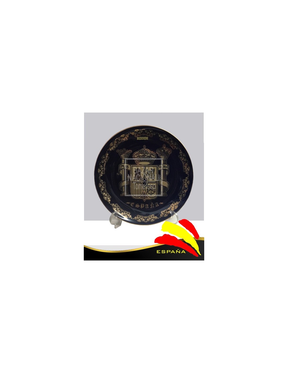 Plato decorativo con el emblema del escudo constitucional, impreso en oro sobre fondo azul cobalto. Se entrega con pié para sobremesa.