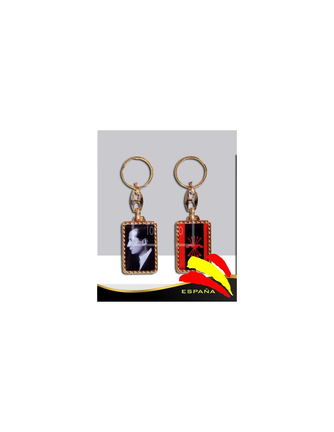 Llavero metálico con doble imagen, José Antonio Primo de Rivera en blanco y negro y las Cinco Flechas de Falange Española a color.