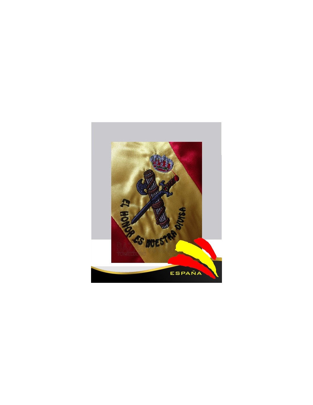Bandera confeccionada en raso con relleno interior para darle cuerpo y bordado del emblema de la Guardia Civil Española. Medida de la Bandera 1,50 x 1 mtrs. y medida del bordado 20 x 20 cmts.