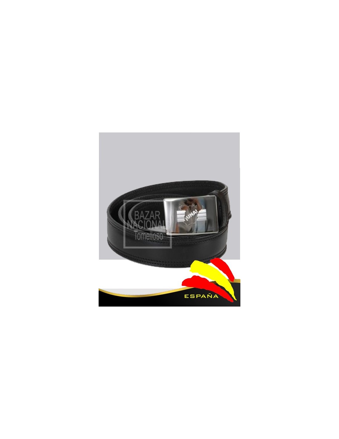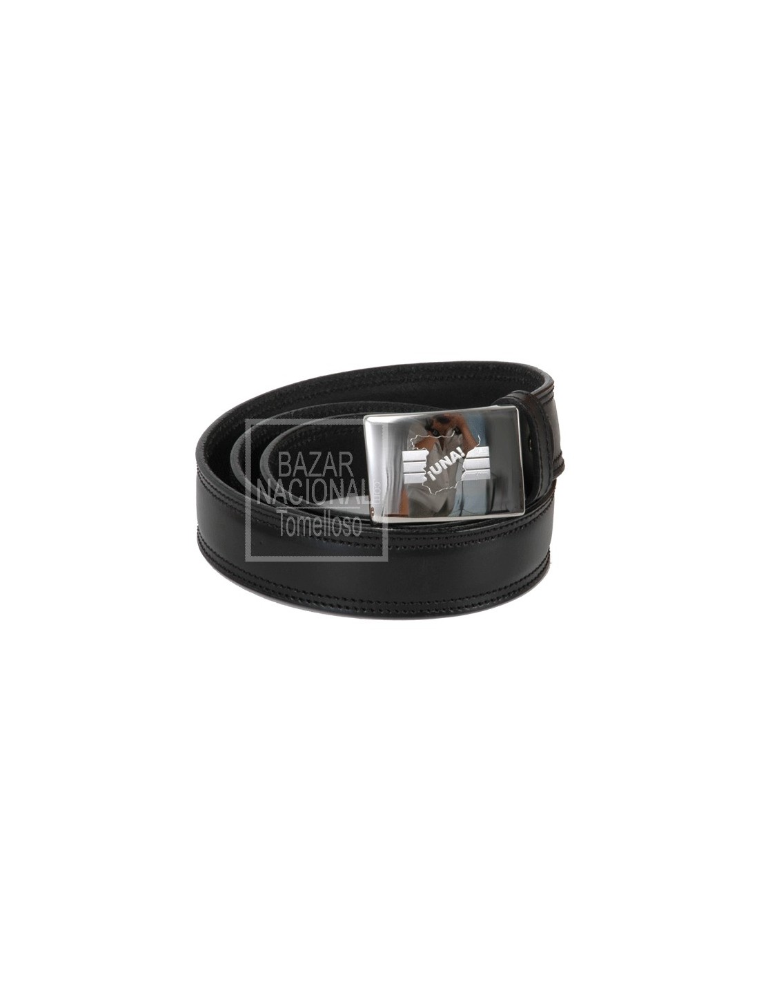 Cinturón de piel en color negro con hebilla cromada y grabada con el emblema de ESPAÑA UNA. Medida 123 cm. Se presenta en caja de cartón para regalo.