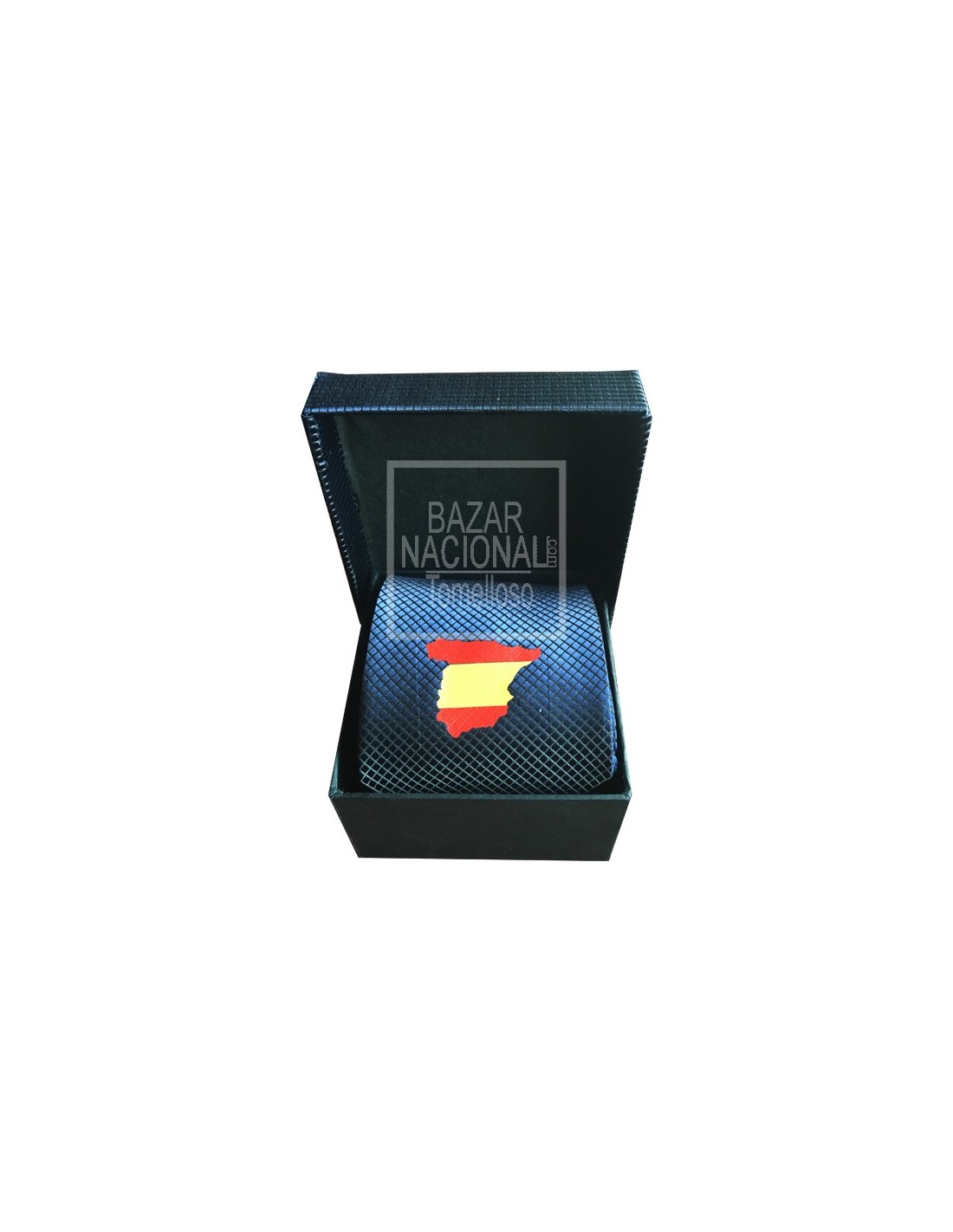 Corbata azul marino con detalle en el inferior del Mapa de España y los colores de su Bandera. Se presenta en caja para regalo.
