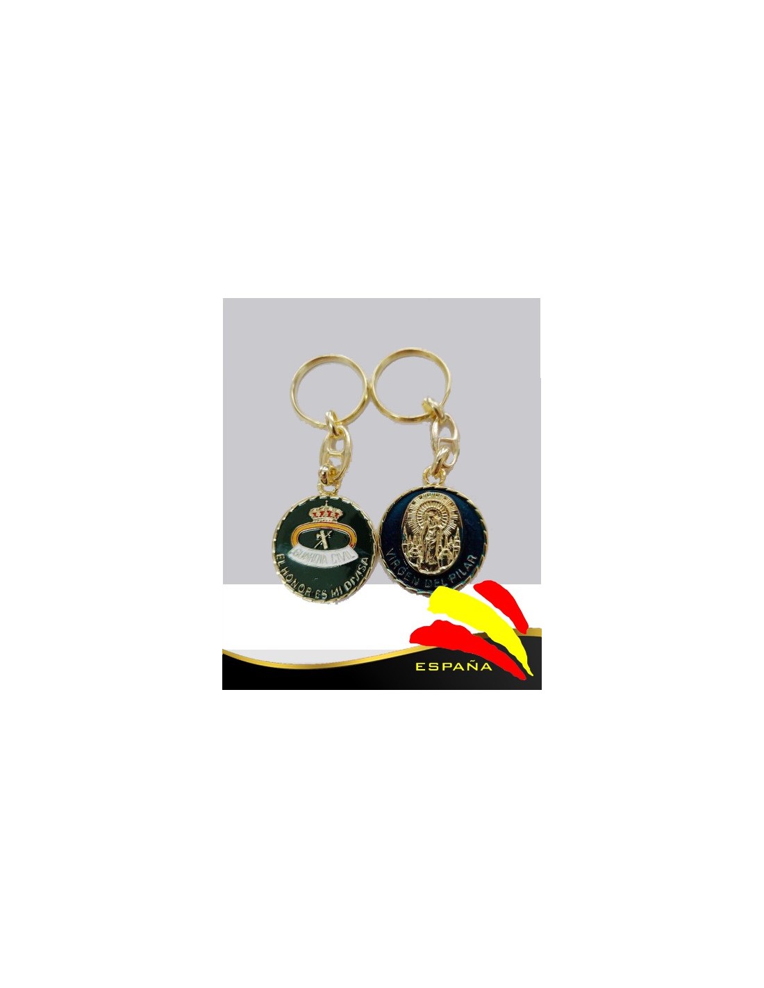 Llavero de metal doble cara con emblema de la Guardia Civil y la Virgen del Pilar. Esmaltado a todo color.